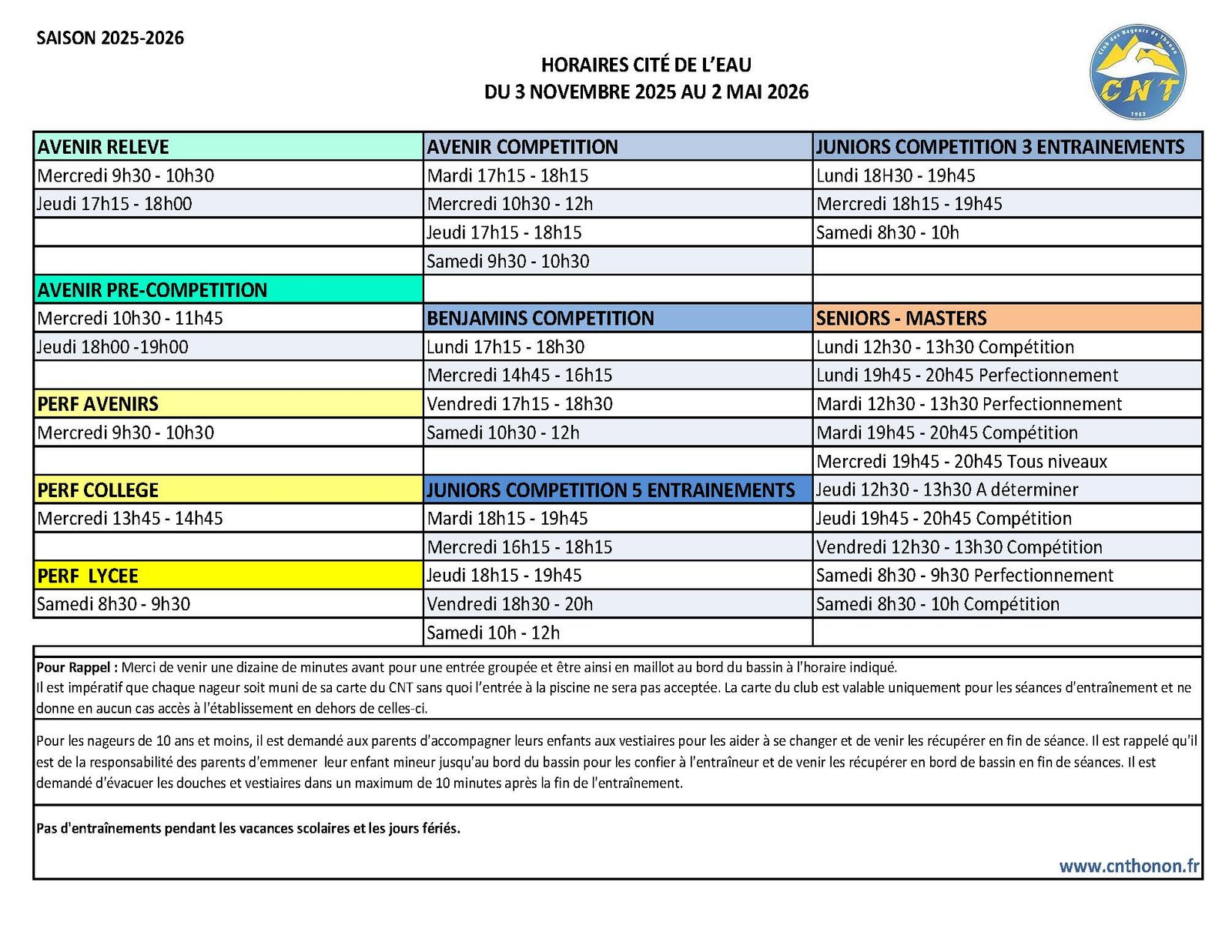 Pour intégrer le CNT, l’enfant doit avoir au moins 6 ans au 31 décembre de l’année d’inscription (niveau CP) et avoir une certaine autonomie dans l’eau. Le niveau exigé dépend de la catégorie d’âge et du ou des groupes correspondants. Un test préalable de niveau est obligatoire avant toute inscription. Si le nageur a déjà été licencié FFN, il peut être dispensé de test préalable.